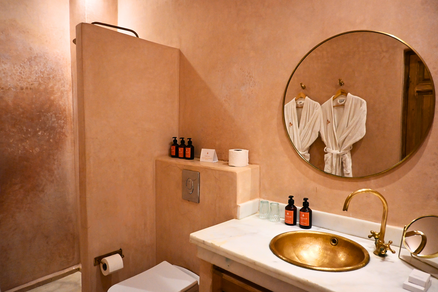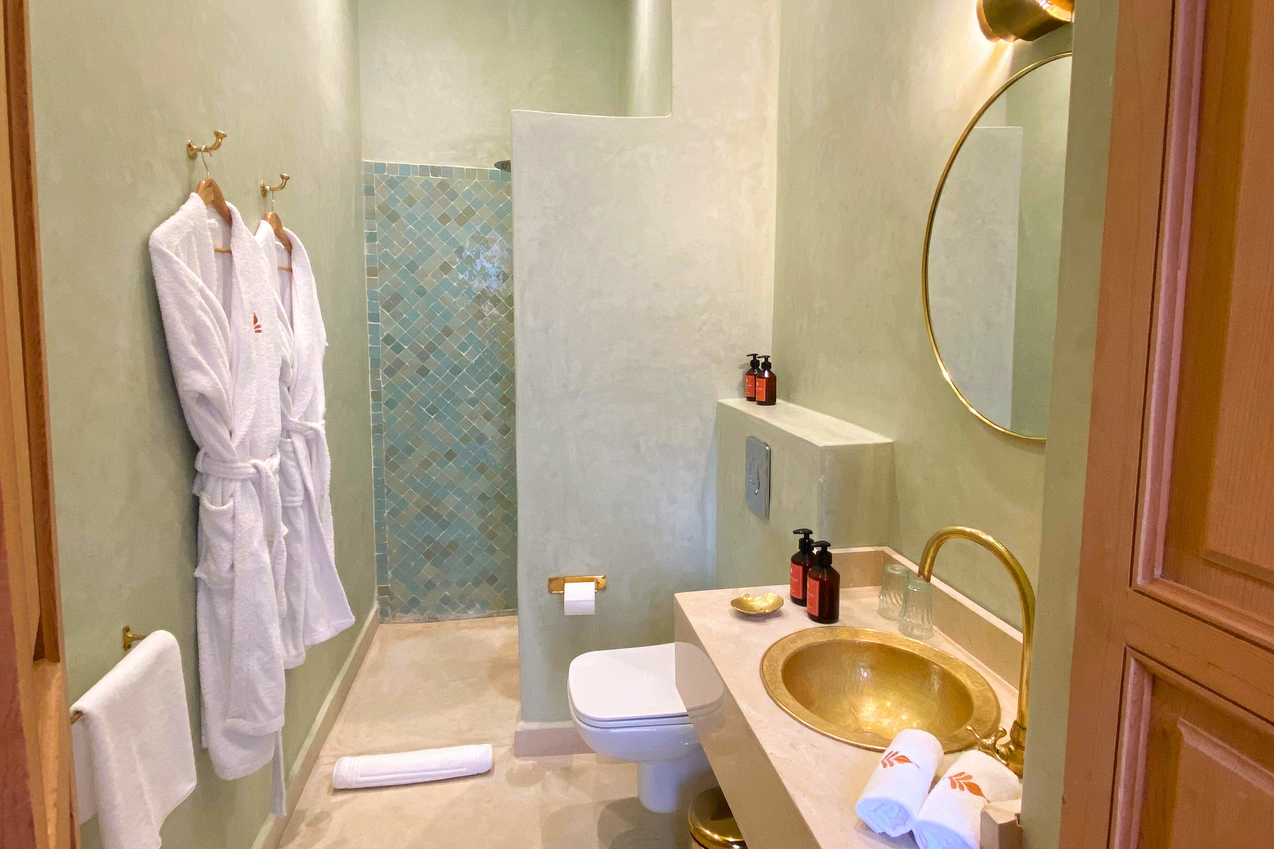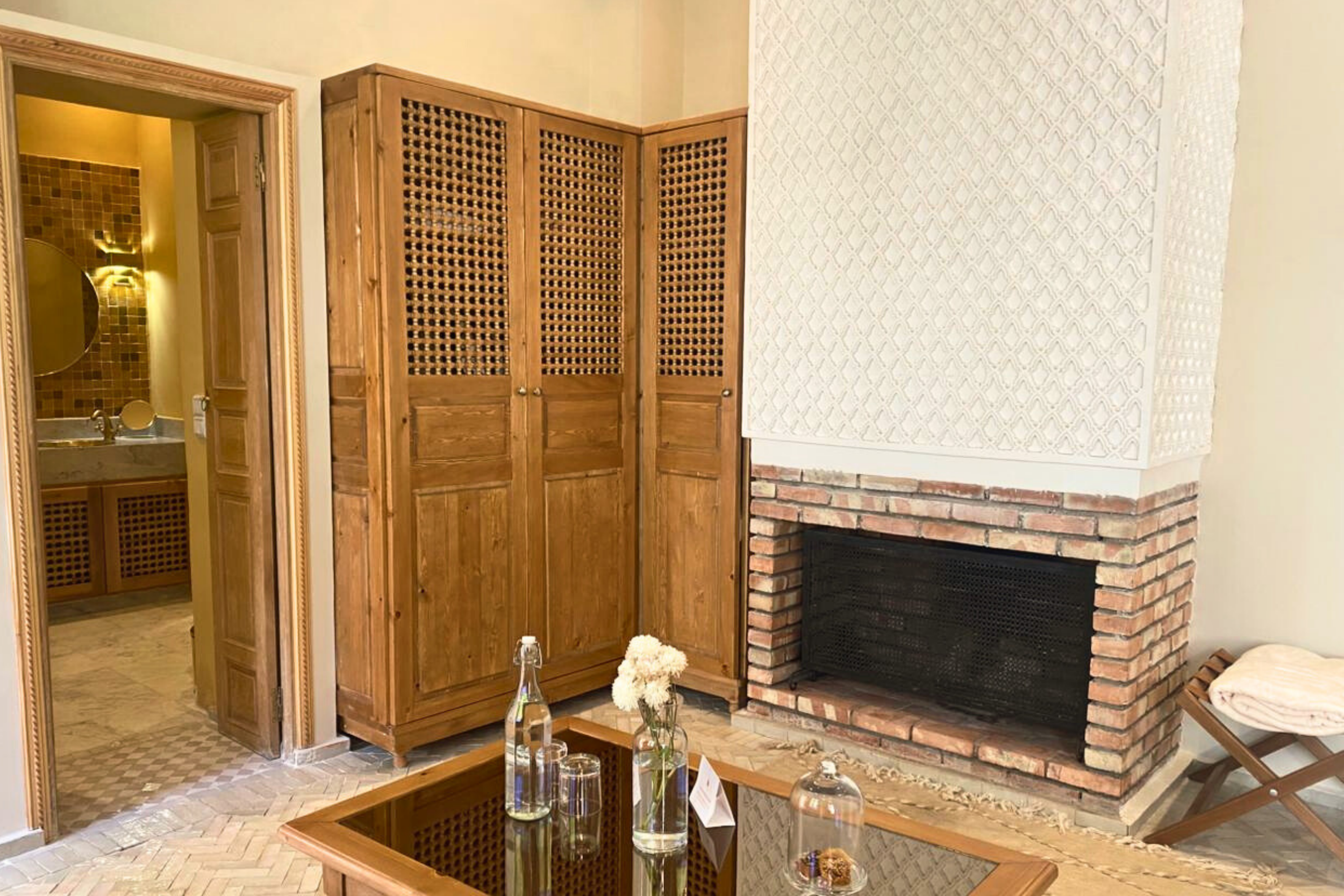 Handcrafted zellige walls, smooth tadelakt finishes, and copper-and-marble accents lend an artisanal richness throughout. Depending on the suite, guests may enjoy marble flooring in the room or bathroom, or the added charm of a traditional fireplace. The spacious ensuite bathroom features a walk-in shower and refined materials that highlight the region’s craftsmanship.