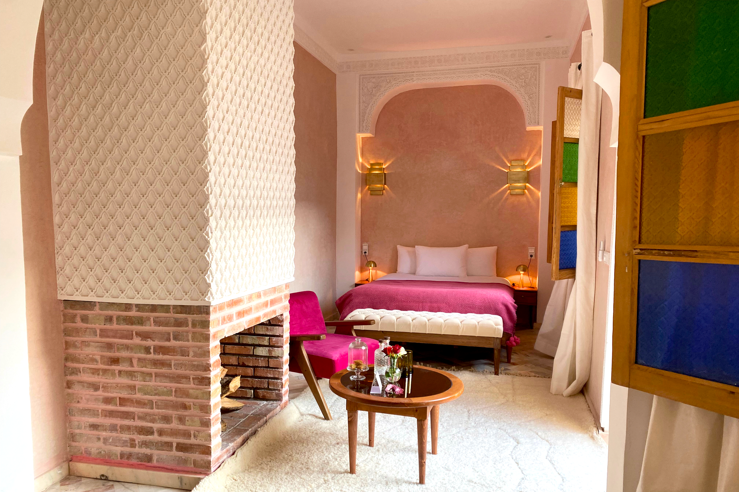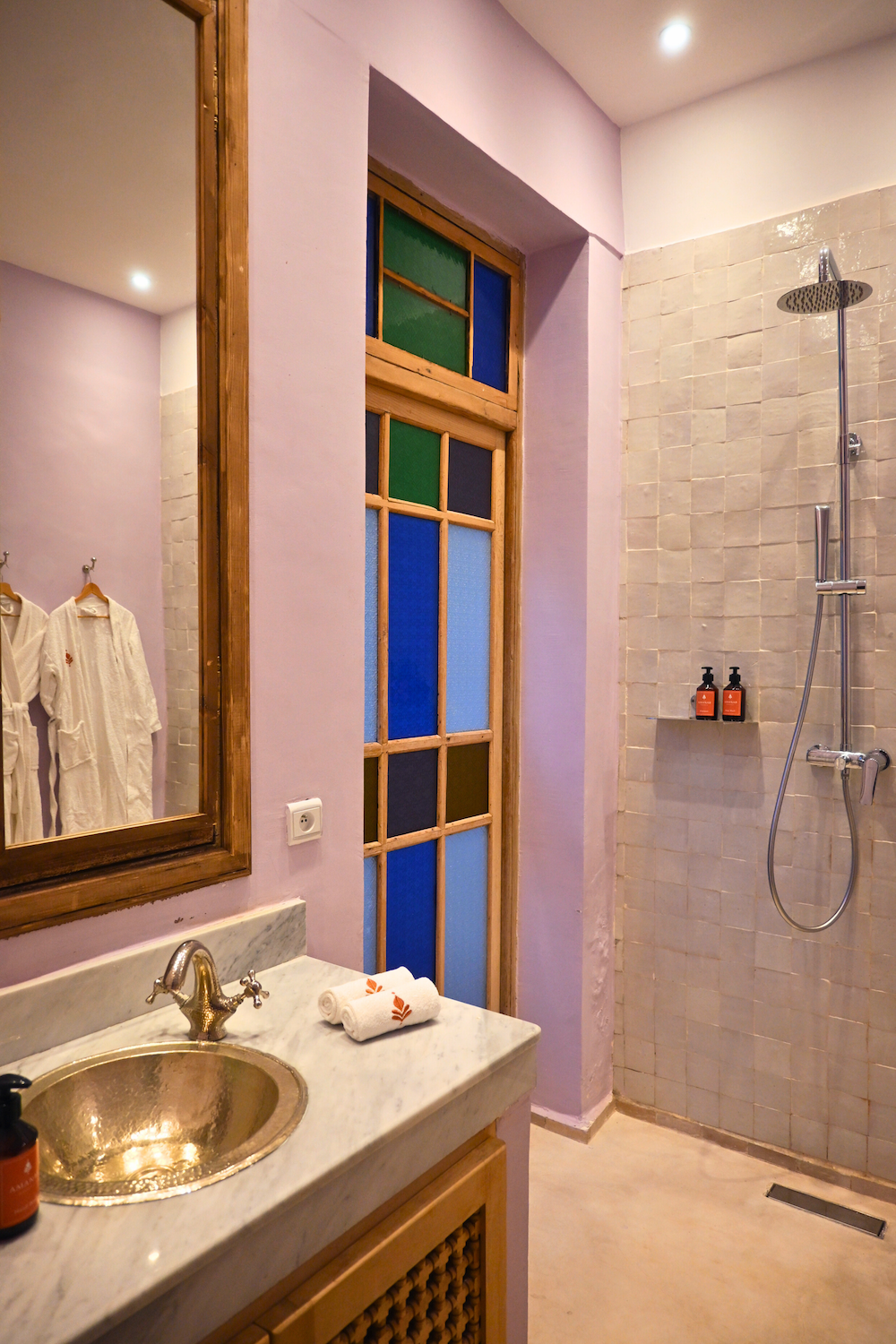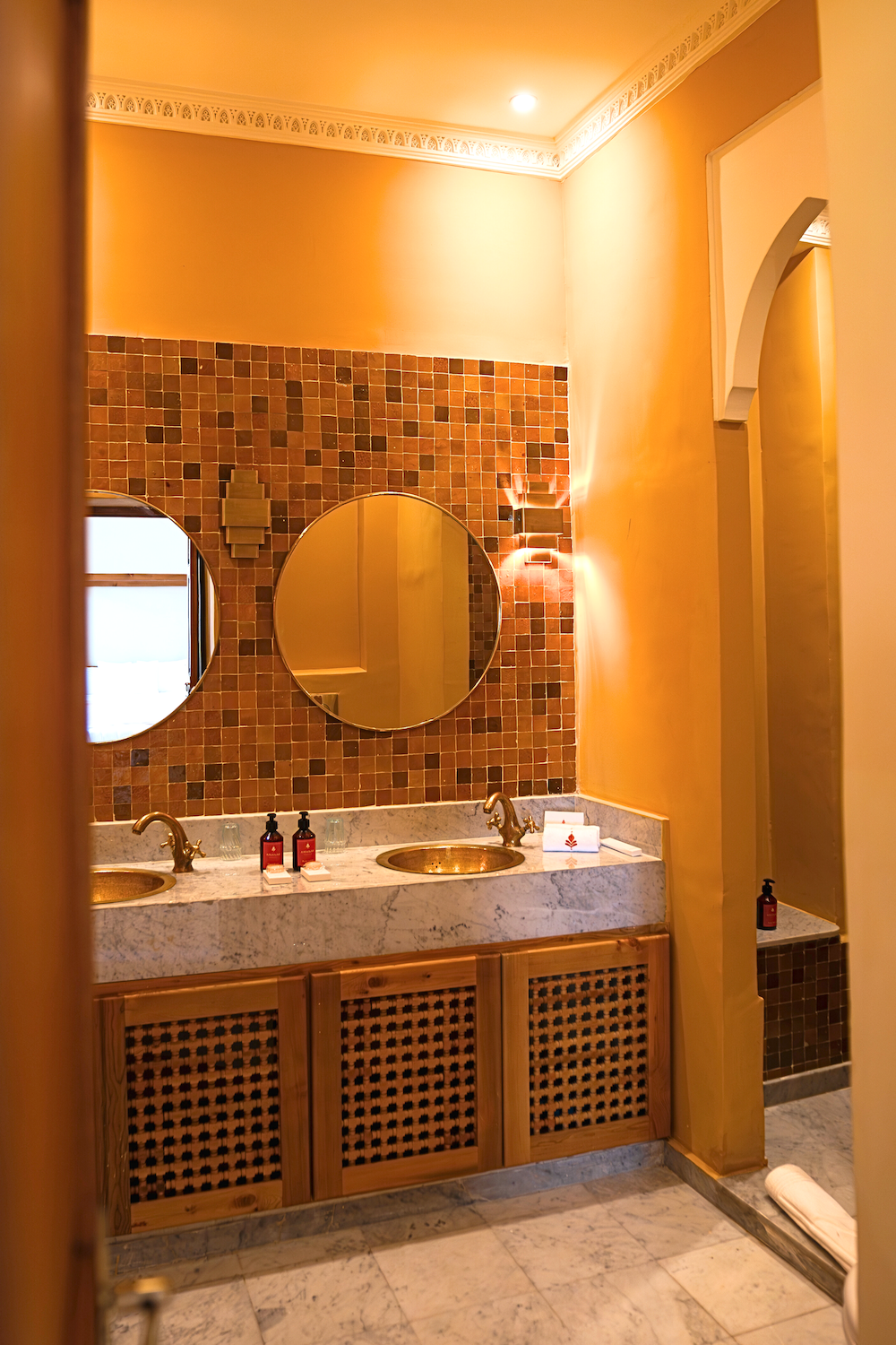 Handcrafted zellige walls, smooth tadelakt finishes, and copper-and-marble accents lend an artisanal richness throughout. Depending on the suite, guests may enjoy marble flooring in the room or bathroom, or the added charm of a traditional fireplace. The spacious ensuite bathroom features a walk-in shower and refined materials that highlight the region’s craftsmanship.