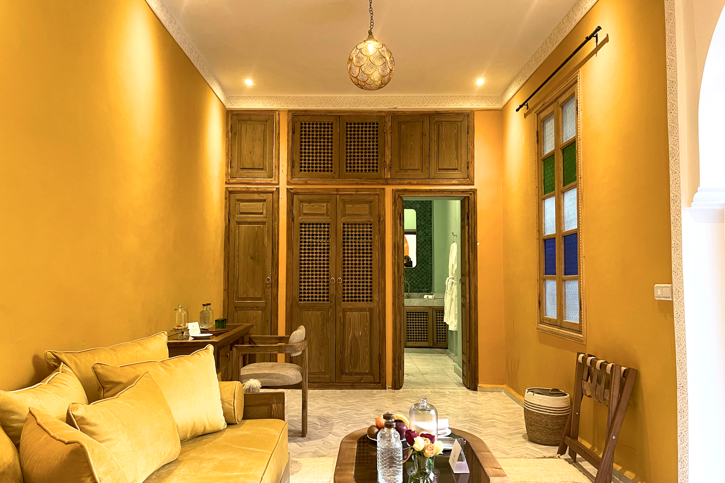 Each of our two Senior Suites (approx. 35 m² / 377 sq ft) — in Rose and Saffron — offers an expansive and tranquil retreat, thoughtfully designed for comfort and understated luxury. Generous in size, every suite includes a comfortable sitting area adorned with warm Berber textiles, creating an inviting space to unwind.